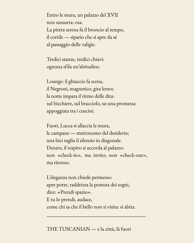 A quiet-luxury boutique hotel tucked away inside Lucca’s ancient city walls.