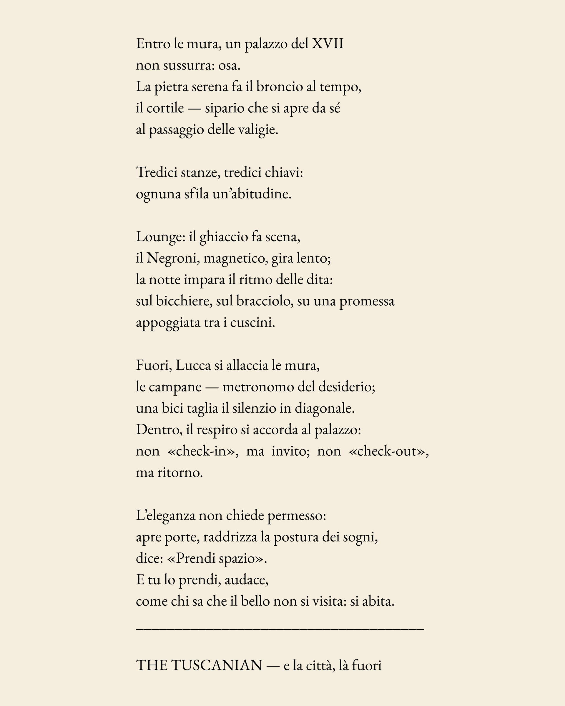 Situato in un palazzo del XVII secolo nel cuore di Lucca, The Tuscanian fonde eleganza senza tempo e comfort moderni. Il nostro hotel offre 13 camere e suite arredate con gusto, un cortile interno e un servizio su misura per farti sentire a casa.